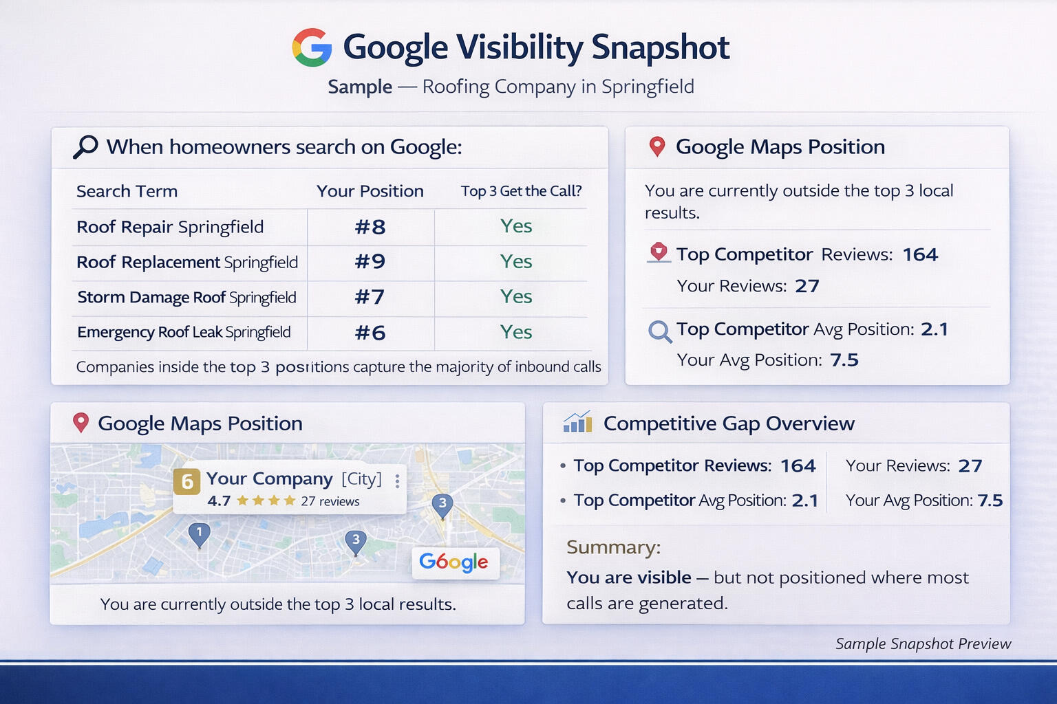 Before another roofing company takes a job in your city, see where you actually rank. Our custom Google Visibility Snapshot shows whether you’re winning on Google — or quietly losing revenue to competitors who show up first.